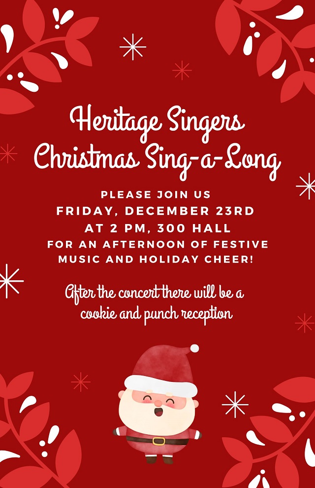 On Friday, December 23rd at 2:00 pm, we invite our residents and their families to join our Heritage Singers choir in singing all of our favorite Christmas songs! After the performance, please join us for a cookie and punch reception. We hope to see you there!